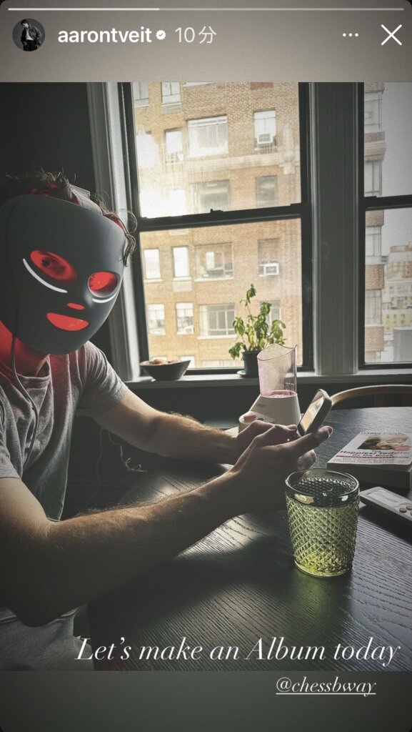 アーロンは、レコーディング前にお肌と喉のお手入れ。テーブルの上にはイヤイヤ期の赤ちゃんとの上手な接し方の本『Happiest Toddler on the Block』が。☺️